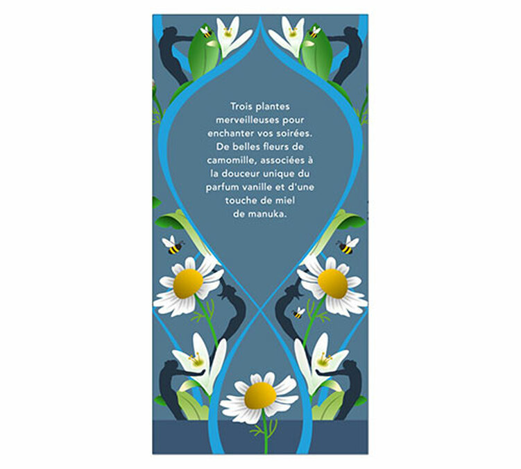 Ingrédients (issus du commerce équitable) : fleur de petite camomille* (68,5%), graine de fenouils* (graine de fenouil doux et amer), racine de réglisse*, granules de miel de manuka* (miel de manuka 0,8%, gomme arabique, maltodextrine), arôme naturel de vanille* (3,5%). *biologique