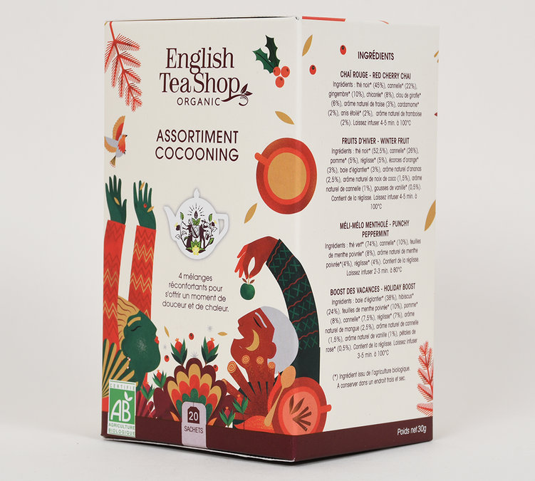 Indulge yourself at the start of winter with this selection of comforting organic teas and herbal teas. The English Tea Shop's Winter Cocooning range includes two black teas, a green tea and an infusion made from certified organic ingredients. This box is ideal for entertaining family and friends, offering a range to please everyone, or for those who like to change the flavours of their drinks regularly.