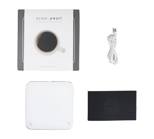 La balance ACAIA Pearl blanche est livrée avec 1 tapis en silicone résistant à la chaleur, 1 câble de charge USB Type-C.