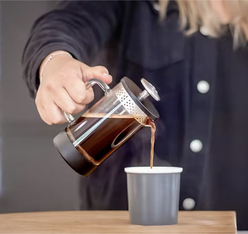 La cafetière à piston est le modèle de cafetière manuelle le plus facile à utiliser. La préparation du café est pour ainsi dire inratable dans ce type de cafetière ! Il vous suffit de mettre 1 c. à c. de café moulu spécial cafetière à piston par tasse à café dans le pichet, de couvrir ave 90 ml d'eau chaude non bouillante par tasse à café, et de laisser infuser 4 minutes. Une fois l'infusion terminée, le piston doit être pressé lentement et régulièrment, et le café peut être servir dans un verre double paroi ou une tasse à café.