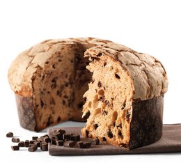 Panettone (without raisins and candied fruit), with chocolate chips, topped with hazelnut icing