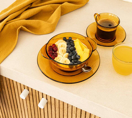 Voici un bol dans l'esprit des traditionnels bols bretons, reconnaissable avec ses oreilles, très pratiques. La seule différence se trouve dans sa fabrication en verre. C'est un bol au style rétro de couleur vermeil, qui apportera de la douceur à votre petit-déjeuner. Il traversera le temps de manière à ce que vous puissiez le transmettre aux générations futures.