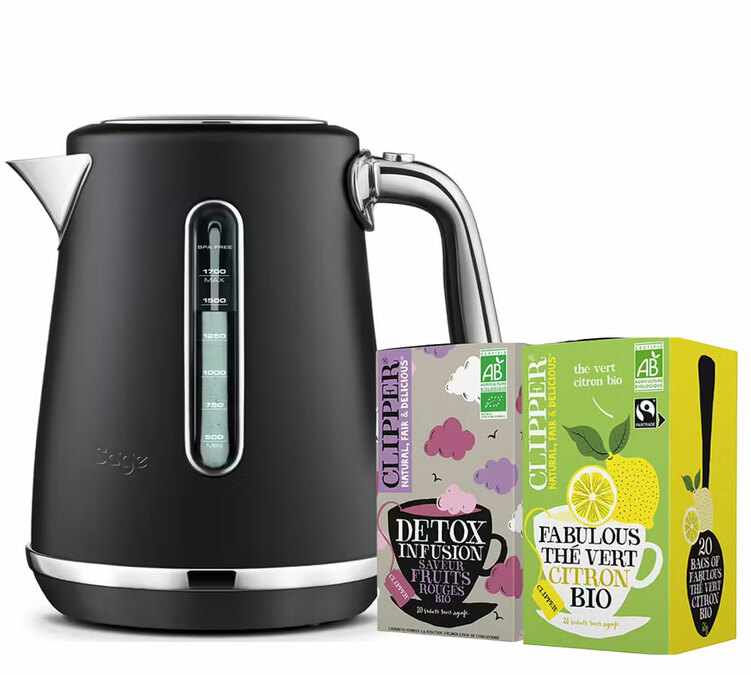 Découvrez la bouilloire au noir truffe profond de Sage : une bouilloire de luxe aux capacités irréprochables, garantie 2 ans. La gamme Soft Top propose des contenances de 1.7L et une chauffe très rapide. En plus, vous recevrez du thé en vrac offert avec l'achat de cette bouilloire électrique.