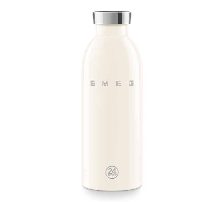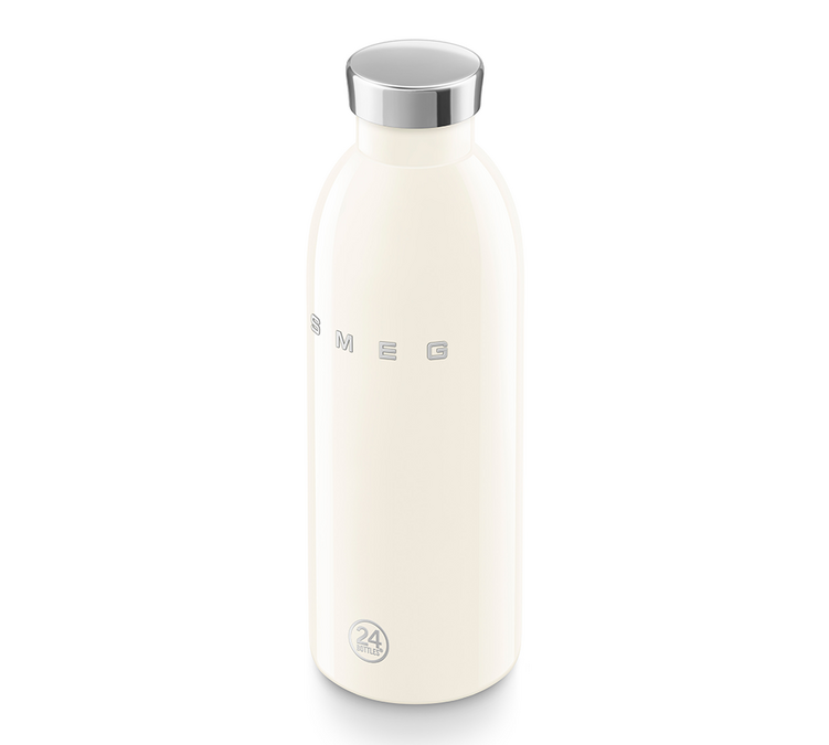 Retrouvez la bouteille isotherme années 50 de Smeg en coloris crème