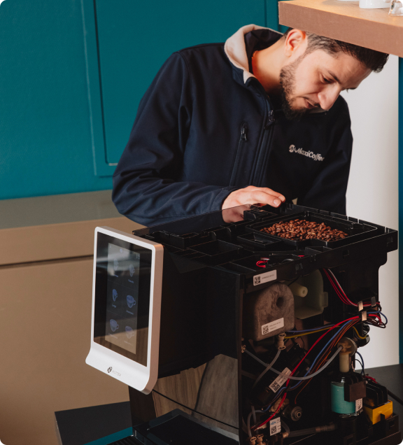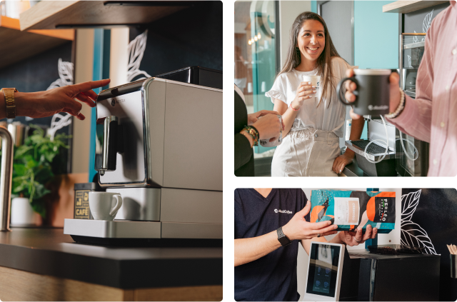 via nos 1500 experts café répartis localement sur toute la France qui créent et gèrent des espaces café sur-mesure chez nos clients professionnels.