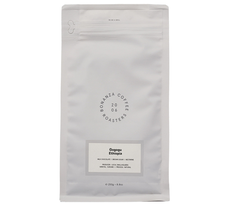 Le café en grain Gogogu de Bonanza Coffee puise son caractère dans les hauts plateaux de la région de Guji, dans le sud de l’Éthiopie.