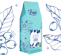 Discover the Oasis Blend from Cafés Lugat, an exceptional organic coffee bean from organic farming, combining the best terroirs of Brazil, Guatemala, El Salvador and Peru. Thanks to its careful medium+ roasting, this arabica coffee reveals a delicious and spicy aromatic profile, with comforting notes of cocoa, hazelnut, gingerbread and brown sugar. Ideal for lovers of speciality coffee with a perfect balance. 250 g packet.