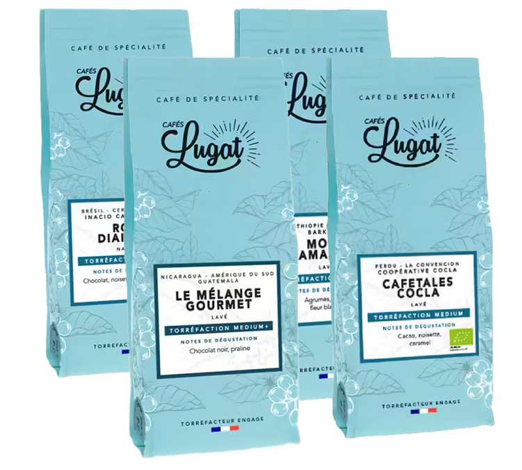 Le format en 250 g se prête merveilleusement bien à la découverte, il vous permet de tester 4 cafés différents en un seul pack. Chercher un café ou des cafés adaptés à votre préférence boisson, c'est devenu simple avec les cafés en grain Lugat !