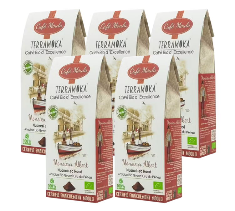 Vous êtes une entreprise à la recherche d'un café bio torréfié en France ? Alors Monsieur Albert est ce qu'il vous faut, c'est un café 100% Arabica, provenant du pays des Lamas, le Pérou. Un café moulu torréfier artisanalement en France par un champion triplement étoilé ; Sébastien Maurer. À la dégustation, vous serez envouté par sa saveur fruitée et une longueur en bouche persistante. Puis en choisissant Monsieur Albert de TerraMoka, vous optez pour un café grand cru, éthique et éco-responsable. En effet, Monsieur Albert est issu de l'agriculture biologique et son emballage est bio compostable.