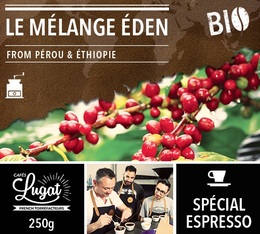Ce café moulu Le Mélange Eden est un mélange d'Arabica bio d'Ethiopie et du Pérou spécialement assemblé et torréfié par l'équipe de torréfaction des Cafés Lugat. Ce café, issu d'une torréfaction medium, vous offrira un espresso de qualité aux notes d'agrumes et de chocolat. Un café à la fois vif et gourmand ! Conditionnement : 250g.