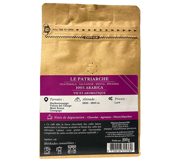 Dégustez ce café moulu Le Patriarche composé d'Arabicas grands crus du Guatemala, du Kenya et du Salvador. Vous aurez une tasse vive et aromatique. Café assemblé et torréfié artisanalement en France. Conditionnement : 200 g.