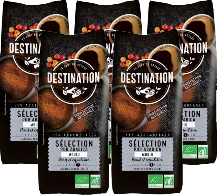 Cet assemblage de café moulu Bio Sélection 100% Arabicas de Destination à l'arôme délicat a été cultivé en haute altitude sur des terroirs volcaniques (sols riches en minéraux). La mouture de café est adaptée aux cafetières filtres . ll est conditionné en 5 sachets de 1kg.