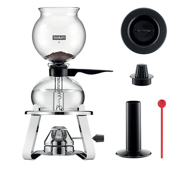 La cafetière à dépression Pebo de Bodum est composée de deux carafes en verre borosilicate superposées, insérés l'un dans l'autre et reliés par une tige de verre. L'eau chauffée monte par la tige de verre jusqu'à atteindre le récipient qui contient le café moulu. Le café infusé est aspiré vers le récipient inférieur par la dépression qui s'y produit dès qu'on retire la cafetière de la plaque chauffante. Le brûleur a été spécialement conçu pour s'adapter à la cafetière à dépression Pebo de Bodum. L'ouverture se fait par une manivelle pour contrôler le débit et ainsi la puissance de chauffe.