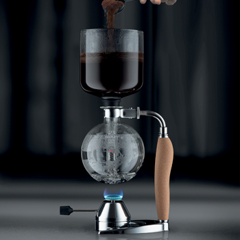 2. Broyez 15g de café en mouture moyenne et place le dans la tulipe. Allumez le brûleur. L'eau va monter dans le globe supérieur. Baissez la flamme du brûleur et mélangez.