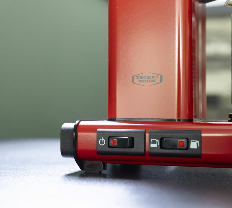 Mais le rouge ne suffit pas à faire un bon café. C’est pourquoi la machine intègre un mélangeur d’arômes discret dans la verseuse. Ce petit tuyau mélange le café au fil de l’écoulement, pour éviter les écarts de goût entre les premières et dernières tasses. Résultat : un café uniforme et équilibré, à chaque service, sans avoir à remuer.