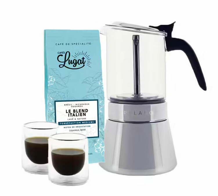 La première est un paquet de café moulu spécialement pour cafetière italienne de la marque Cafés Lugat. Ce paquet de 250 g offre un café de torréfaction moyenne, mais néanmoins très corsé, avec un mélange 80% Arabica et 20% Robusta aux notes chaudes et épicées.