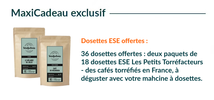 MaxiCoffee vous offre 36 dosettes de café compatibles (ESE) pour cet achat. Couleur grise. Garantie 2 ans.