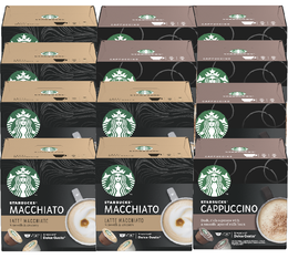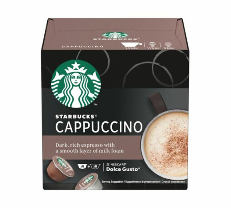 Envie de goûter les excellentes boissons lactées de la marque américaine Starbucks ? C'est désormais possible à la maison grâce à ces capsules Cappuccino compatibles avec votre machine Nescafé* Dolce Gusto*. Vous allez succomber à la puissance aromatique du café associée à l'onctuosité de la mousse de lait. Conditionnement : boîte de 12 capsules (6 capsules de café et 6 capsules de lait).