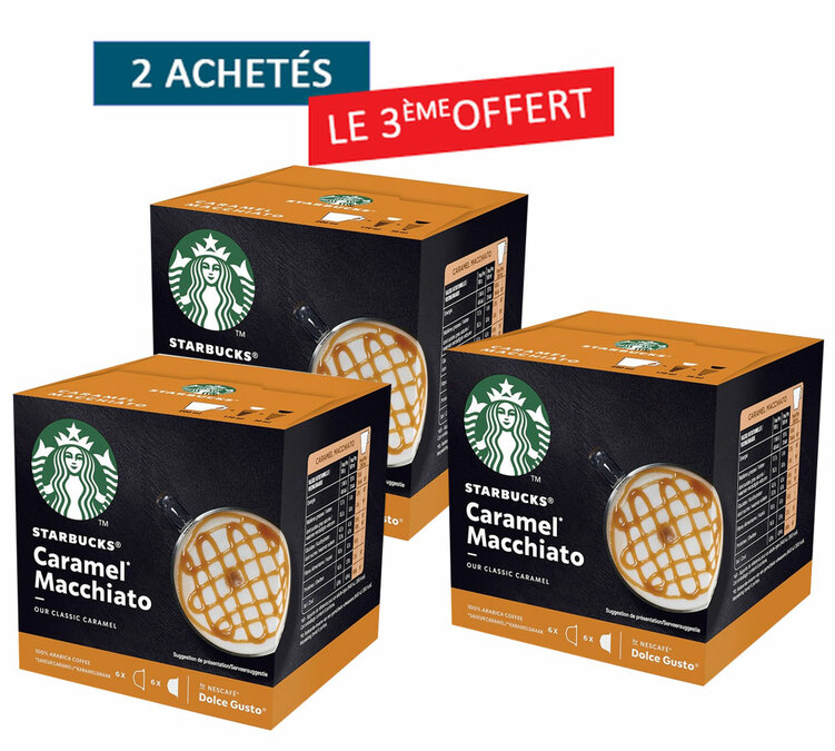 Profitez de cette offre spéciale deux boîtes achetées, la 3èmes Offerte ! Envie d'une boisson irrésistiblement gourmande ? Voici pour vous les capsules Latte Macchiato au bon goût de caramel, développées par la célèbre marque américaine Starbucks. En tasse, vous trouverez un café riche en arôme, une mousse de lait onctueuse et une pointe gourmande de caramel. Conditionnement : boîte de 6 capsules café et 6 capsules lait et caramel. Capsules compatibles Nescafe® Dolce Gusto®.