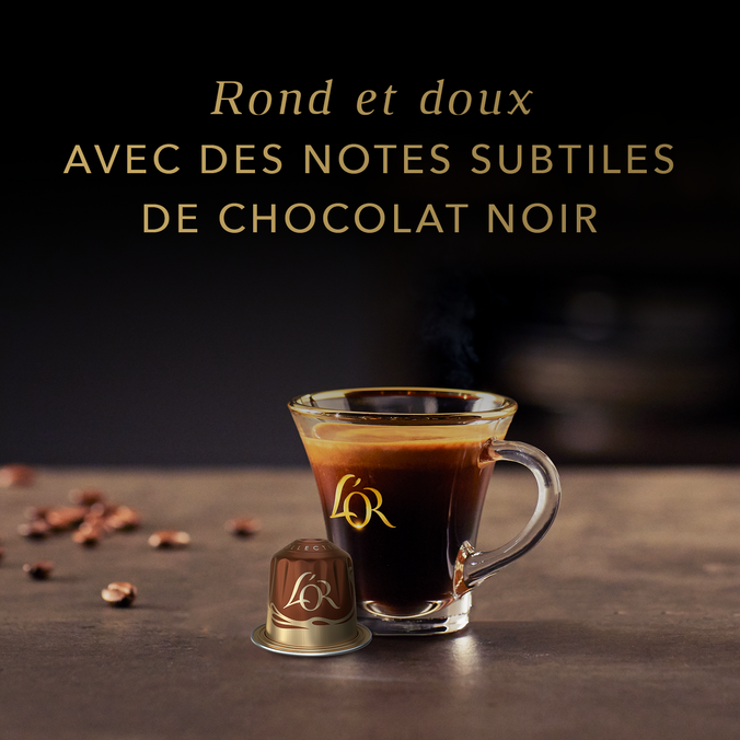 Ces capsules compatibles Nespresso* Original sont issues d'un blend torréfié en France, offrant un espresso doux de 40 ml avec des arômes complexes de chocolat noir, délicieusement sucré et dépourvu d'amertume.