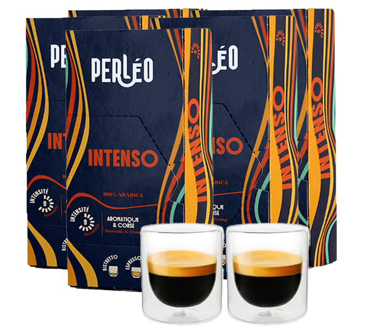 Découvrez un bundle complet pour les amateurs de café : 50 capsules Perléo Intenso et deux verres Pylano 10 cl, alliant puissance aromatique et design élégant pour une dégustation optimale à la maison ou au bureau.