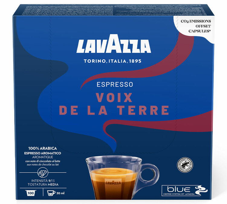 Lavazza Blue 'Voix de la Terre' espresso capsules. Coffee from Rainforest Alliance certified farms.100% Arabica (Honduras, Peru & Colombia). For a balanced espresso with lovely floral notes. 100 capsules for Lavazza Blue machines.