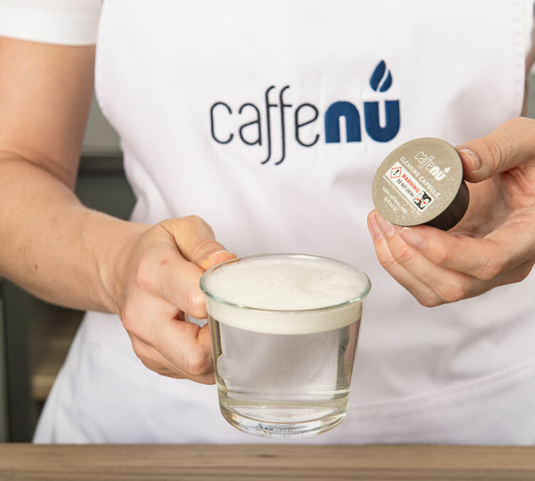 Remplissez le réservoir avec 500 ml d’eau et placez un récipient sous le bec verseur. Insérez une capsule nettoyante Caffenu comme une capsule de café.