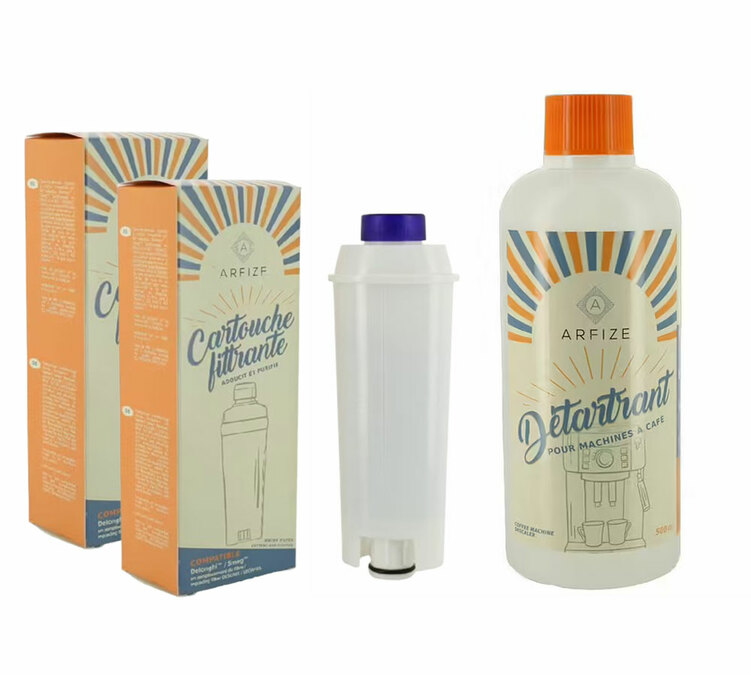Entretenir sa machine à café devient simple avec ce pack Arfize compatible De’Longhi, pensé pour réunir l’essentiel dans une seule solution. Avec ses 2 cartouches filtrantes et son détartrant 500 ml, il accompagne votre machine dans la durée et vous aide à préserver, jour après jour, la qualité de vos cafés.
