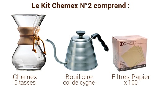 Ce produit comprend une chemex 6 tasses (900ml), une bouilloire en col de cygne Baristator et une boîte de 100 filtres papiers pour Chemex. La bouilloire vous permet de verser de l'eau mais pas de la chauffer.