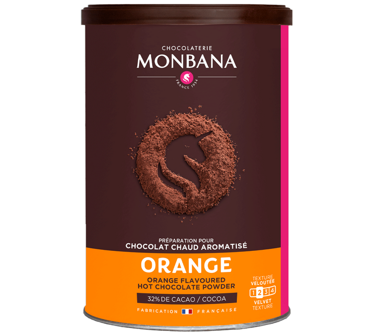 Une idée originale pour donner une saveur orange à votre chocolat. Monbana propose dans une très belle boîte hermétique une gamme étonnante de chocolat en poudre aromatisé.