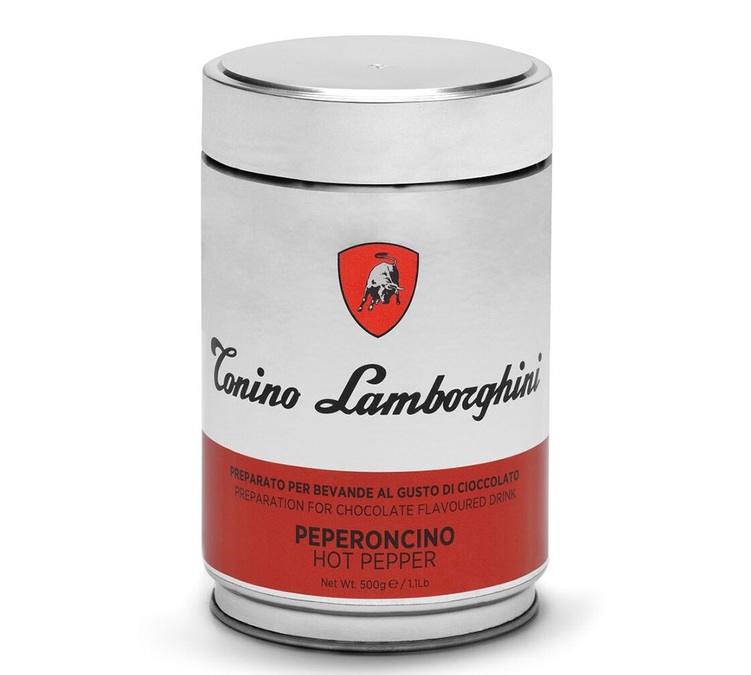 Une boite métallique de 500g de chocolat en poudre aromatisé au piment signée Tonino Lamborghini. Une recette originiale avec la doucuer du cacao et l'épice du piment rouge.