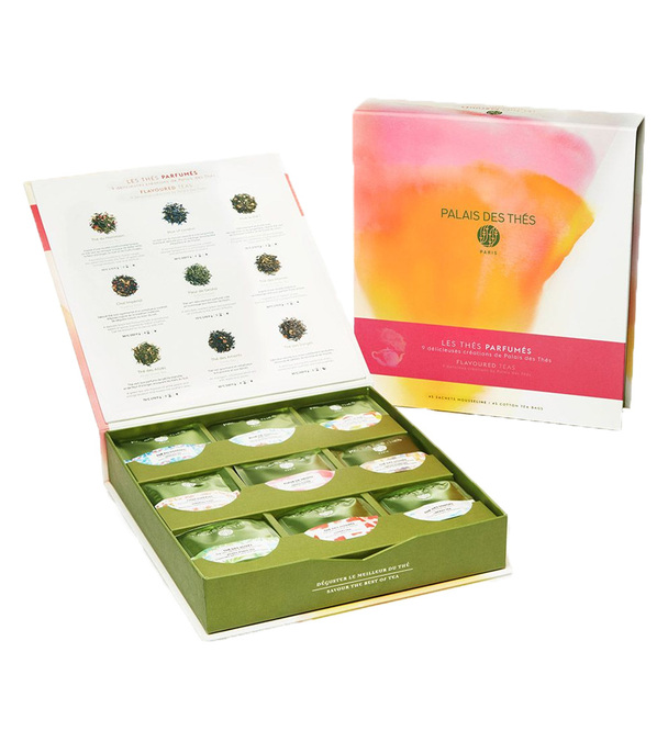 Ce coffret contient 9 références de thés parfumés différentes (5 sachets de chaque), toutes aussi emblématiques les unes que les autres. Variez les plaisirs chaque jour avec des thés verts parfumés, des thés noirs épicés, des oolongs acidulés... Tant de mélanges riches en goût qui feront frémir vos papilles ! Voici les thés présents dans ce coffret :