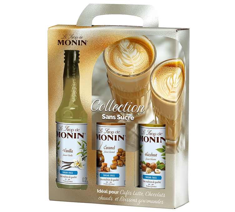 Noisette, vanille et caramel, c'est le trio de saveurs incontournables pour aromatiser vos cafés, chocolats, milk shake, desserts et autres boissons chaudes et froides ! Monin propose ce trio de saveurs dans un coffret de sirops sans sucre. Chaque sirop est conditionné dans une bouteille en verre de 25 cl, un format parfait pour varier les saveurs.