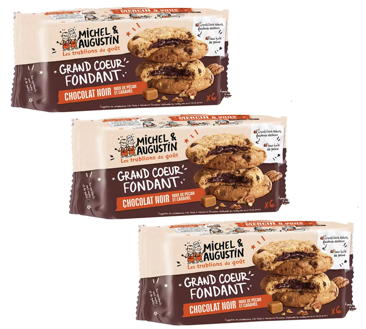 Lot Boîtes Cookies Cœur Fondant Chocolat Noir Noix de Pécan Caramel - 3 x 6 cookies - MICHEL & AUGUSTIN DLUO 2026.06.01