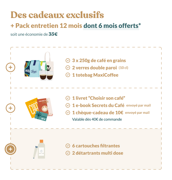 Pour profiter de votre machine en toute sérénité, nous vous avons préparé un pack d'entretien de 12 mois. Vous protègerez votre machine contre le calcaire et les impuretés. Un café est composé à 98 % d'eau, si votre eau n'est pas filtrée, cela va altérer les arômes de votre café.