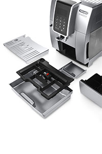 L'égouttoir de la cafetière à grain DeLonghi Dinamica a été entièrement repensé : Avec sa grille intérieure amovible et démontable, l'égouttoir passe au lave-vaisselle pour un entretien encore plus simple.
