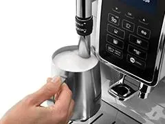La Delonghi Dinamica ECAM 350.35.SB propose un design inédit avec des fonctionnalités maîtrisées, un look élégant, et une utilisation intuitive. La qualité des boissons est convaiquante pour ce prix. Sa buse vapeur facilite l'expérience "lactée" et vous permet de réaliser assez facilement le cappuccino .... Le Doppio + est simplement génial pour les amateurs de café intense. A tester au plus vite ;) Pour les gros consommateurs de boissons lactées, je vous recommande de vous tourner vers les Dinamica équipées de Carafes : mêmes boissons café au top et une expérience facilitée pour les cappuccinos et autres boissons gourmandes !