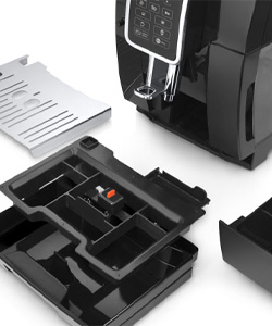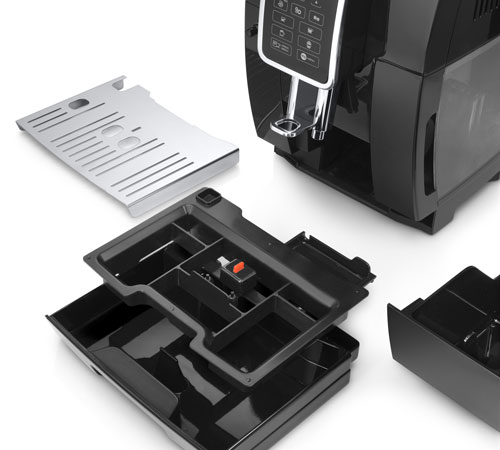 L'égouttoir de la cafetière à grain DeLonghi Dinamica a été entièrement repensé : Avec sa grille intérieure amovible et démontable, l'égouttoir passe au lave-vaisselle pour un entretien encore plus simple.