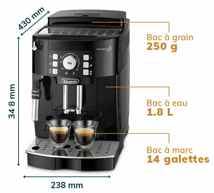 Exclusivement disponible chez MaxiCoffee, la DeLonghi Magnifica S 22.127.B s’adresse aux professionnels ou établissements à la recherche d’une machine fiable et peu encombrante, sans compromis sur l’autonomie. Inspirée du modèle phare 22.140.B, cette version intègre des optimisations notables pour un usage plus fluide au quotidien.