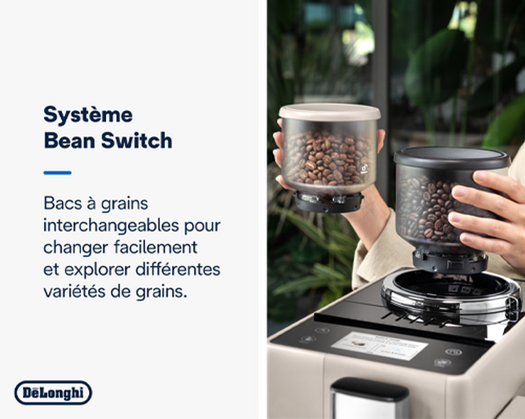 La technologie exclusive de cette cafetière, le Bean Switch System, a été récompensée à la Foire de Paris du Grand Prix de l'Innovation d'Or, ce qui annonce de très belles promesses. Mais ce n'est pas la seule surprise de la marque : DeLonghi propose une nouvelle technologie intéressante pour les 10 g de café en grain restants lors du changement des bacs à grain. L'idée : vous vous régalez avec un dernier café... puis vous pourrez ensuite choisir, soit de purger le système, soit de conserver le reliquat et de le mixer avec le nouveau café mis en place.