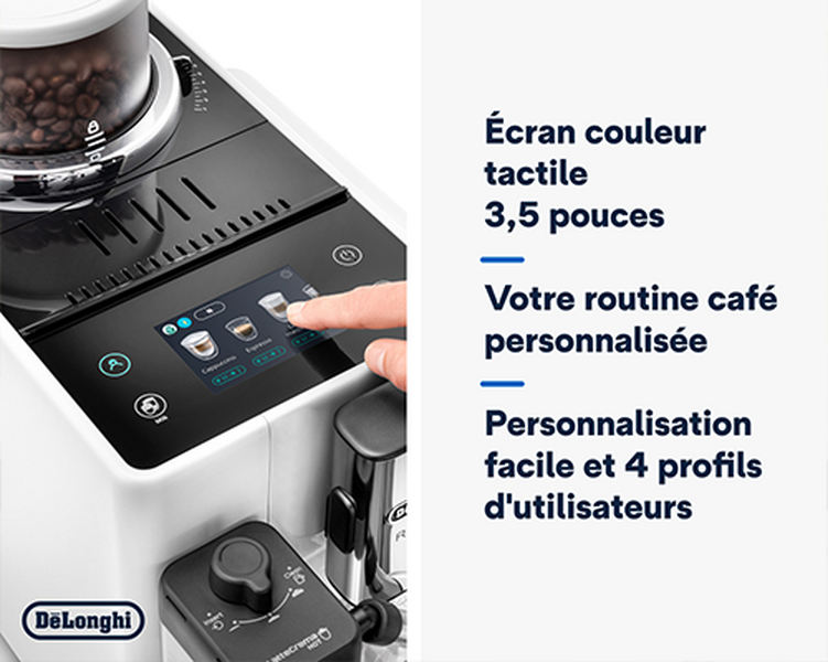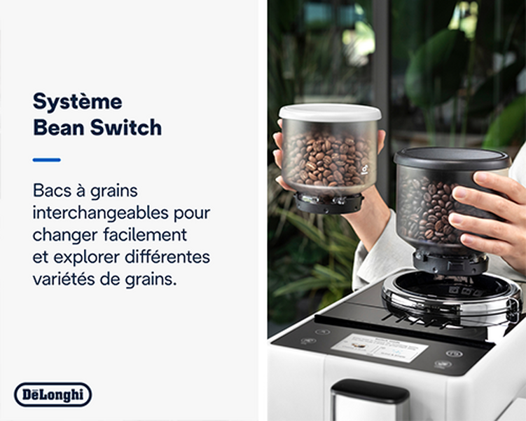 La technologie exclusive de cette cafetière, le Bean Switch System, a été récompensée à la Foire de Paris du Grand Prix de l'Innovation d'Or, ce qui annonce de très belles promesses. Mais ce n'est pas la seule surprise de la marque : DeLonghi propose une nouvelle technologie intéressante pour les 10 g de café en grain restants lors du changement des bacs à grain. L'idée : vous vous régalez avec un dernier café... puis vous pourrez ensuite choisir, soit de purger le système, soit de conserver le reliquat et de le mixer avec le nouveau café mis en place.