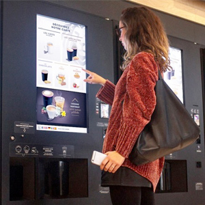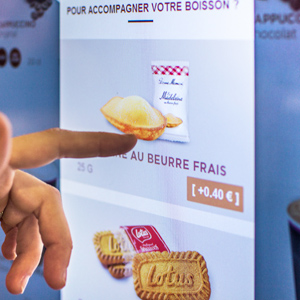 Machine connectée, l’écran permet également de communiquer au travers des vidéos sur les produits disponibles mais également de créer de l’interaction en proposant des jeux-concours, quiz, etc.