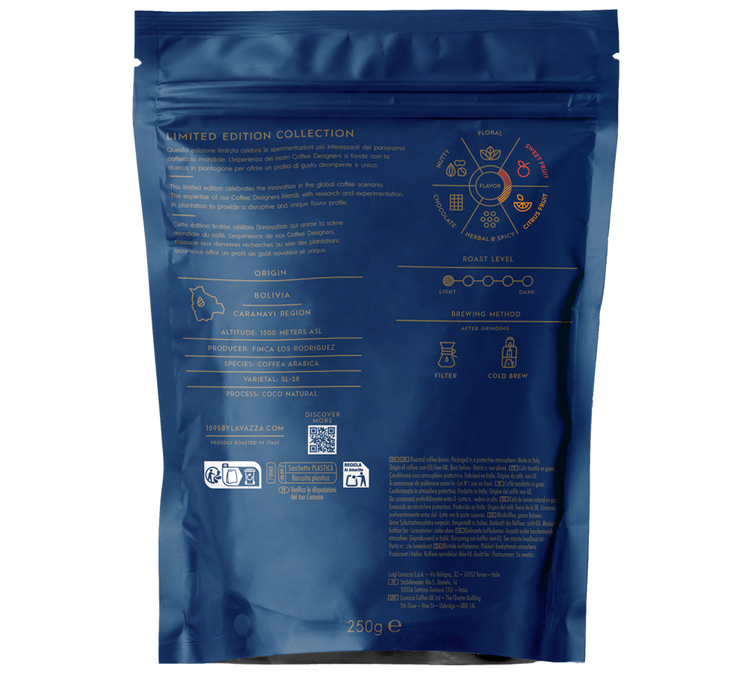 Behind each bean is a story of passion, innovation and respect for nature. Thanks to the exclusive ‘Coco Natural’ process, a slow and gentle drying of the coffee cherries inspired by cocoa fermentation and developed by the Rodríguez family, this coffee offers a unique aromatic complexity. More than just a coffee, Sol de Yungas is an invitation to travel, a sensory experience created by 1895 Coffee Designers by Lavazza, for true specialty coffee lovers.