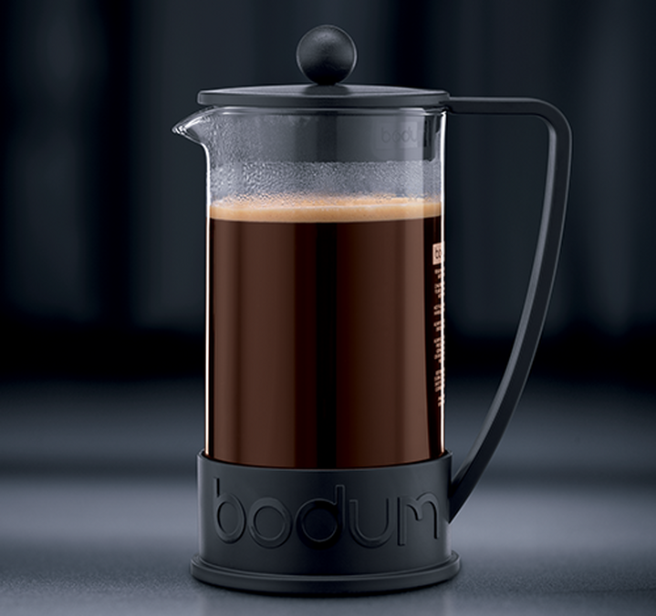 This Bodum Brazil French Press coffee maker with Bodum logo has a capacity for 8 cups (or 1L). Borosilicate glass jug with polypropylene handle and base. Dishwasher-safe.