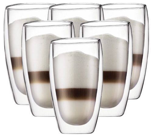 A set of 6 Pavina double wall glasses for hot drinks by Bodum® - 45cl capacity. Perfect for latte, tea and hot chocolate.