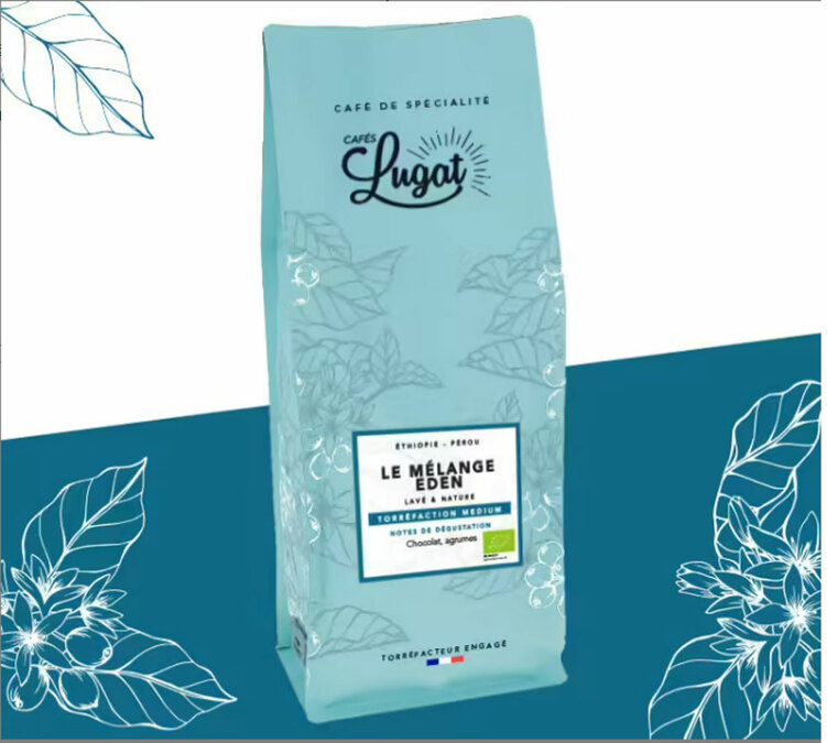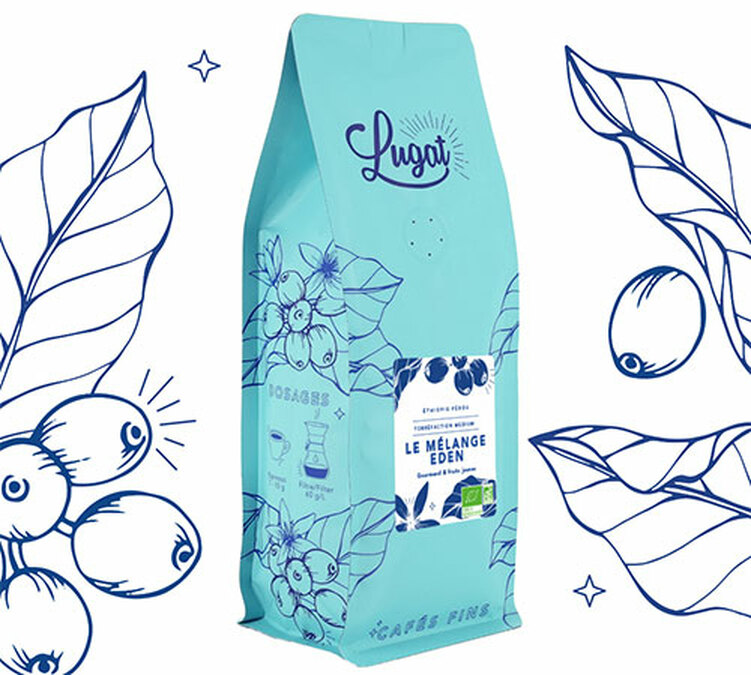 Mélange Eden is a blend of organic Arabica from Ethiopia and Peru. Assembled and roasted by the Cafés Lugat roasting team, this medium roast offers a quality espresso with citrus and chocolate notes. A vibrant and gourmet coffee! 1kg coffee beans.