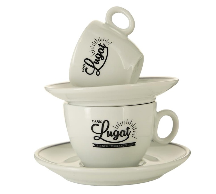Cafés Lugat set of 6 porcelain cappuccino cups and saucers. 17.5 cl capacity. Imagined by our Barista experts to have the perfect capuccino experience. They are shock resistant and perfect to obtain the best crema!