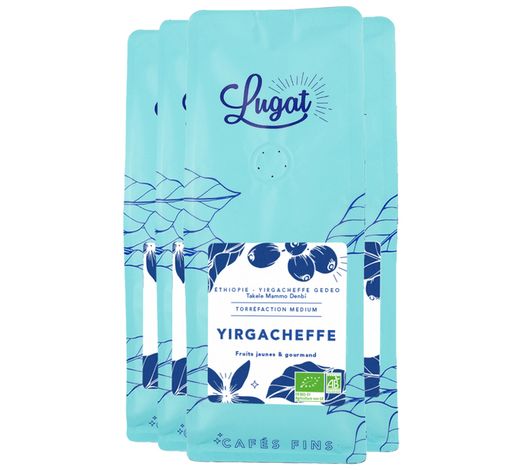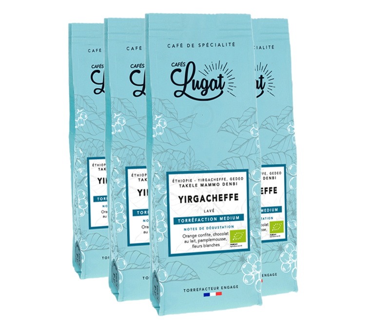 Experience a unique moment of coffee tasting with Cafés Lugat Ethiopia Yirgacheffe organic coffee beans in 1kg bags. The cup will continue to captivate you with its rich and fruity flavours, underlined by a medium roast, with notes of candied orange, grapefruit, milk chocolate and white flowers. This exceptional coffee, grown by Takele Mammo Denbi in the Yirgacheffe region (Gedeo) at altitudes of up to 2,100 m, is packaged in four 250g packs.