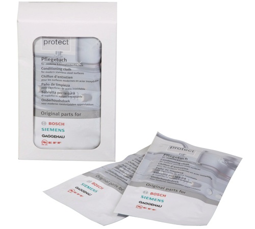 A box of 5 wipes from Bosch. Ideal to clean your stainless steel teapots and other kitchen appliances. These wipes contain a special oil to care for stainless steel. This oil restores the appearance of your surfaces and other stainless steel appliances, preventing dust deposits. 1 box of 5 individually-wrapped wipes.
