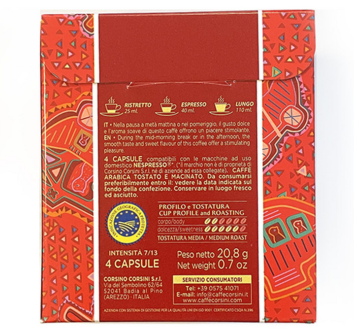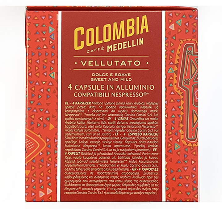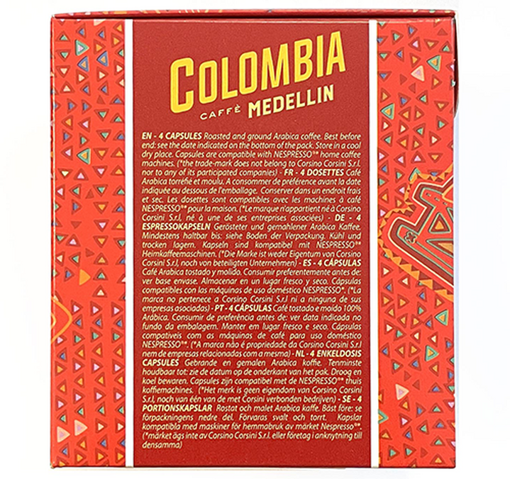 This coffee from Corsini is a 100% Arabica from the Medellin region in the Cordillera Central. It is PGI certified. Presented in a Christmas bauble in the colours of Colombia, these Nespresso* Original compatible pods are ideal for giving to your guests on New Year's Eve. What's more, they're the perfect mild, smooth coffee to end your meal. In the cup, these pods offer a balanced coffee with a light body and lots of sweetness. Rich fruit and cocoa notes are revealed in a gorgeous crema.